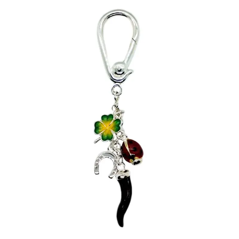 L’inconfondibile stile di Saturno si ritrova nell’ampia collezione di portachiavi in argento, che si divide in due linee principali. La linea classica è interamente in argento lucido, ed include una vasta gamma di soggetti: da quelli tradizionali, come il semplice gancio o la piastra, a quelli tipici della produzione di Saturno, ispirati al mondo animale, marino, sportivo e musicale. Il soggetto viene unito a un gancio personalizzato o al classico anello brisé. La vivacità del colore si ritrova invece nella linea in argento smaltato, in cui un piccolo segmento di catena collega l’anello brisé al soggetto finale, ispirato al mondo degli animali e della natura.